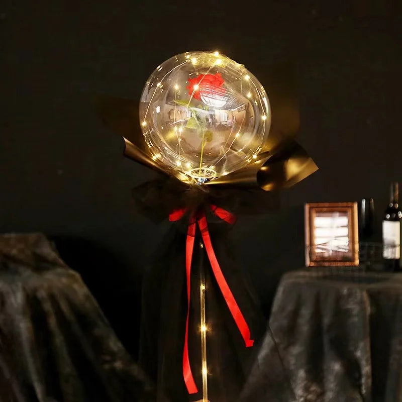Offrez un bouquet unique : roses lumineuses LED dans ballon transparent. Cadeau romantique idéal pour mariage, Saint-Valentin ou anniversaire.